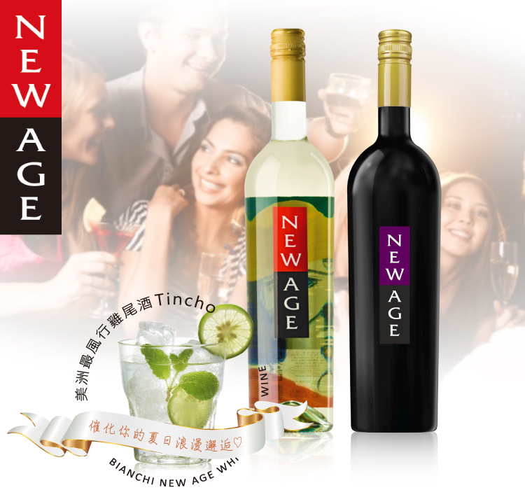New Age 白酒使用 90% Torrontes 及 10% Sauvignon Blanc 白葡萄釀造而成,酒精度只有8.2%。New Age 紅酒則使用70% Bonarda 及30% Malbec 紅葡萄釀造成,酒精度更低,只有6.3%。因此建議飲用溫度在攝氏6度(放冰箱三小時),也就是說要讓酒完全冰透後再喝會比較好喝。調成雞尾酒因為會加冰塊,自然喝起來會有透心涼的感覺。通常 New Age 的酒會被用來當迎賓酒或是餐後甜點酒,不過他的紅白酒微甜爽口的味道,用來搭配沙拉或帶點辣味的料理也很合適。