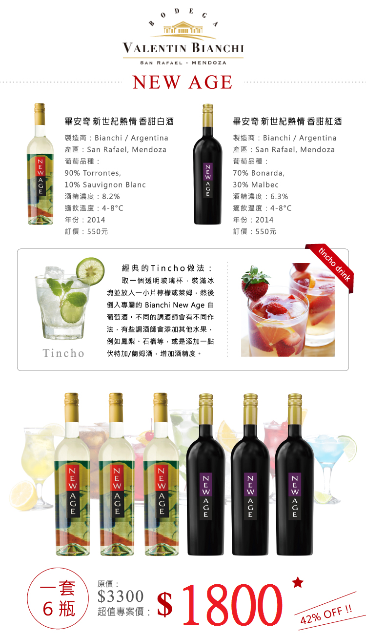 世界經典的 Tincho 雞尾酒發明人:Valentin Eduardo Bianchi,是阿根廷著名 Valentin Bianchi 酒莊的第三代莊主,他的名字因為跟爺爺/酒莊創辦人一樣,所以小時候大家都稱他Tincho - 小Valentin的意思。Tincho 發現他們 New Age 新世紀系列的白葡萄酒,酒精度低而且甜美爽口,加入萊姆後增加酸度喝起來更為順口,於是就用他的小名 Tincho 取名這款葡萄酒雞尾酒。這款雞尾酒一開始先在阿根廷首都布宜諾斯艾利斯的酒吧跟餐廳試賣,得到年輕人熱烈的迴響,後來傳到整個阿根廷,甚至到整個南美洲與美國,成為許多人夏日主要飲品。New Age 新世紀系列的酒款,也從一開始白酒,後來加入微甜紅酒,因其果實味非常濃郁且口感爽快,也備受歡迎。